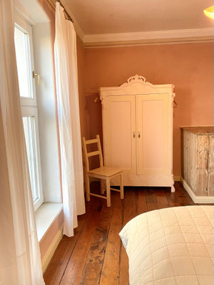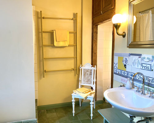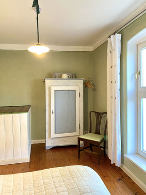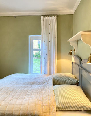 Wir nennen diese Wohnung deshalb "Alte Gutsküche", weil sie früher als Küche der Herren auf Roggow diente. Heute haben unsere Gäste einen separaten Eingang und einen zusätzlichen Ausgang zum Park, wo man sofort im Grünen ist. Dort kann man wunderbar spazieren gehen oder in der Morgensonne zusammen frühstücken.