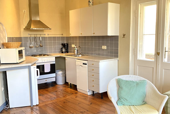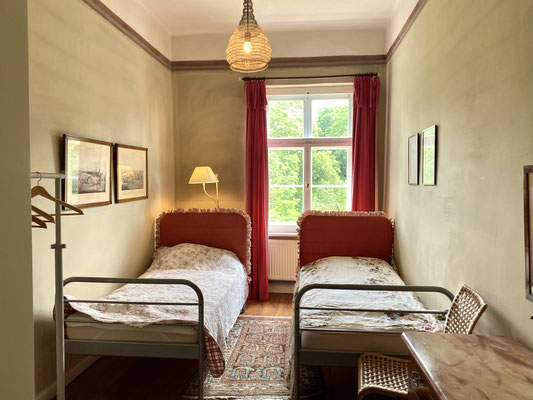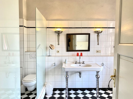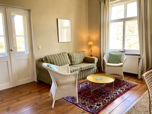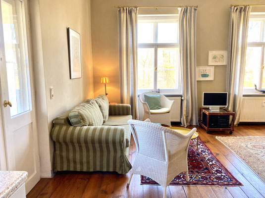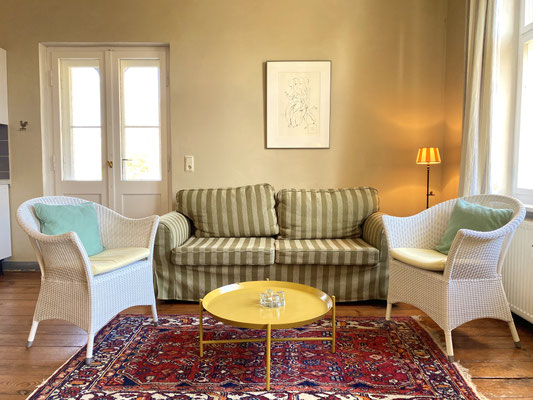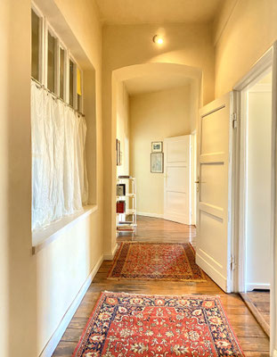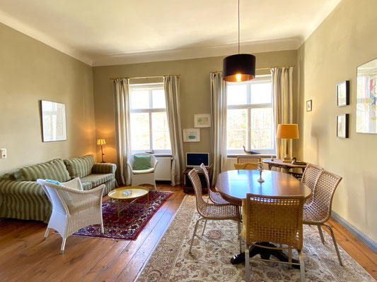 Die Balkonwohnung besticht durch die Gediegenheit der Materialien. Alte Dielen strahlen wohlige Wärme aus, und die hohen Decken und großen Fenster verteilen im Inneren das ganze Licht von draußen. Von allen Zimmern geht der Blick in den gepflegten Park. Uralte Baumgruppen sind, selbst in der Badewanne liegend, zu sehen.